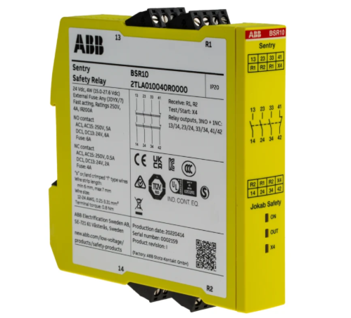 ABB safety relay series standard coding, including safety level, functional module, and version information