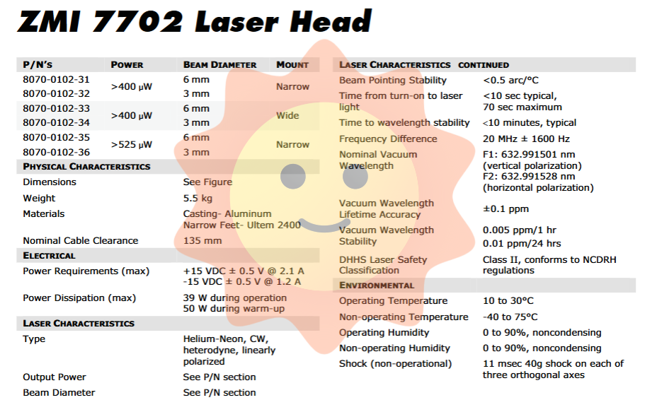 Laser type: Helium Neon laser, continuous wave (CW), heterodyne, linearly polarized.