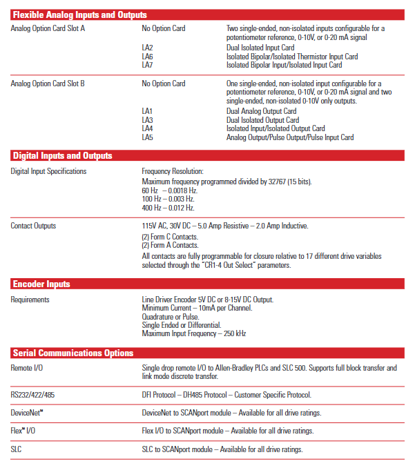 The digital I/O: TB3 terminal supports 115V AC/24V AC/DC/TTL level input and can be programmed with functions such as start, stop, reverse, and preset speed selection; The output contacts (CR1-CR4) support 115V AC/30V DC, 5A resistive/2A inductive loads.