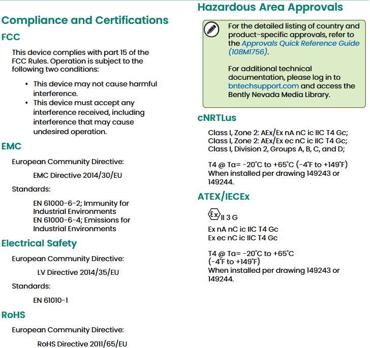 CNRTLus: Class I Zone 2, AEx/Ex nA nC ic IIC T4 Gc; Class I, Zone 2, AEx/Ex ec nC ic IIC T4 Gc; Class I, Zone 2, Groups A, B, C, and D; The ambient temperature Ta is from -20 ° C to+65 ° C (-4 ° F to+149 ° F), and it needs to be installed according to drawing 149243 or 149244.