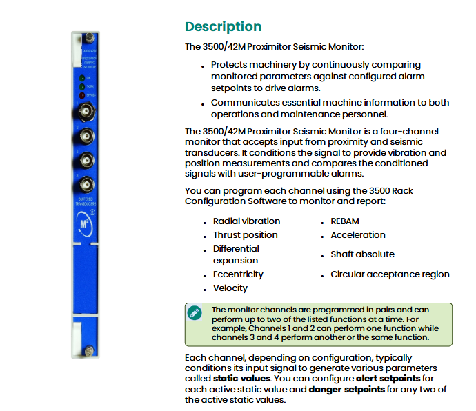 Support programming each channel through 3500 rack configuration software to achieve the following monitoring functions (channel paired programming, each pair can achieve 2 functions simultaneously):