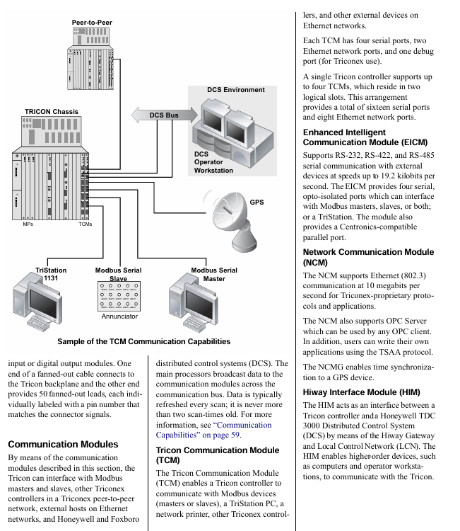 Communication range and supported objects: Tricon can communicate with Modbus master-slave devices, Foxboro I/A Series Nodebus, Honeywell UCN, Honeywell Data Hiway and LCN, Ethernet (802.3) external hosts, other Tricon controllers (peer-to-peer networks), TriStation PC, OPC Server through communication modules.