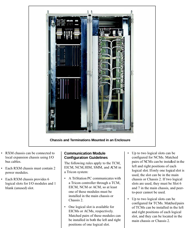 Configuration rule: TriStation PC needs to communicate with Tricon through TCM/EICM/NCM/ACM, and at least one such module needs to be installed in the main Chassis or Chassis 2; Some modules (such as EICM, ACM) have a limit on the number of logical slots, and some modules (such as NCM, TCM) cannot coexist in the same system; If Chassis 2 is equipped with a communication module, it requires an I/O COMM cable (9001 model) instead of a standard I/O bus cable to directly connect to the main Chassis. Chassis 2 can be an I/O expansion Chassis or a main RXM Chassis.