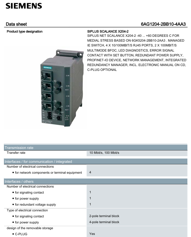 Core positioning: Management type industrial Ethernet switch, supporting PROFINET-IO device functions, integrated redundancy manager, suitable for industrial communication scenarios that require stability and redundancy, with electronic manual (CD format) and optional C-type plug.