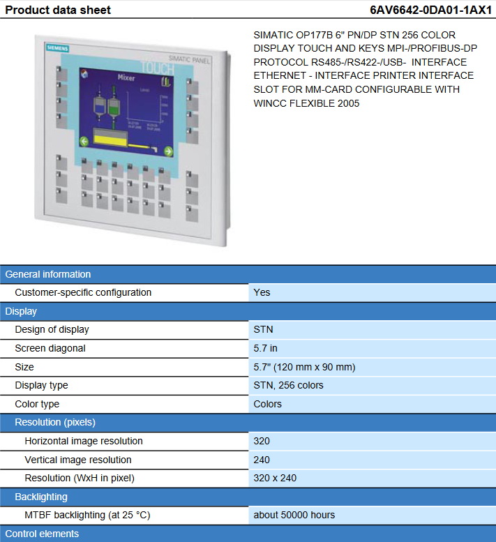 6AV6642-0DA01-1AX1 is the OP177B industrial human-machine interface (HMI) under the Siemens SIMATIC series, designed specifically for industrial automation scenarios. Its core function is to enable visual interaction between operators and controllers (such as PLCs), supporting parameter settings, process monitoring, alarm recording, and other operations. It is compatible with various fields of equipment such as discrete manufacturing and process control (such as machine tools, production lines, control cabinets).