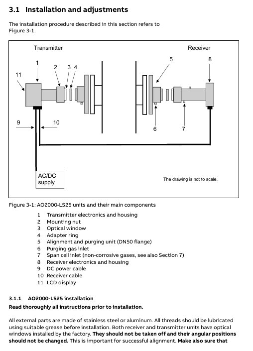 Connect the blowing gas (instrument air or nitrogen), with a flange blowing flow rate of approximately 20-50 l/min, and a transmitter/receiver unit blowing flow rate of<0.5 l/min.