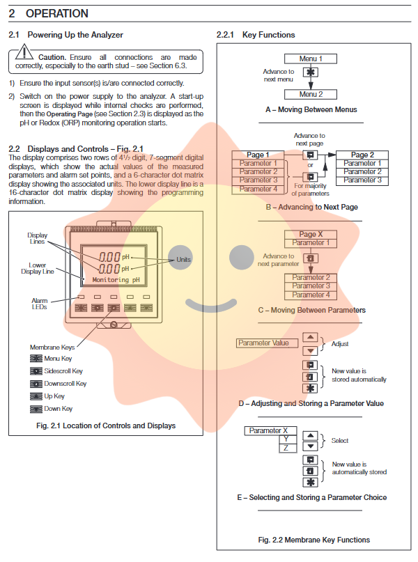 Analog output: Two (standard) or four (optional) fully isolated analog outputs can be configured. The output current can be selected from 0-10mA, 0-20mA, or 4-20mA. Each output can be assigned to any measured variable (pH, mV, or temperature). Programmable output points to any value between 0-22mA in case of system failure to indicate the fault status.