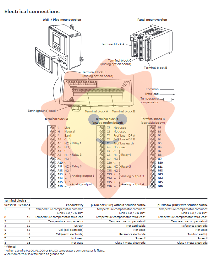 The sensor wiring block with terminal block B as the core can adapt to the wiring requirements of conductivity and pH/ORP sensors, supporting dual sensor inputs (sensor A/B). The wiring of the temperature compensator can be adapted to a 2-wire Pt100/Pt1000/Alco system through jumper wires, and the solution ground (ground rod) is the standard wiring for pH/ORP measurement, ensuring measurement stability. The equipment is also equipped with independent grounding bolts, which can achieve reliable grounding and reduce the impact of on-site electromagnetic interference on measurements.