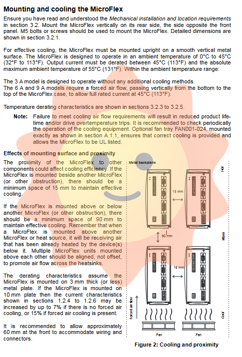 Proper mechanical installation is a prerequisite for ensuring long-term stable operation of the drive. MicroFlex should be installed vertically on the back of the drive and fixed on a smooth vertical metal surface. The manual emphasizes the importance of cooling airflow. Although the 3A model can operate under natural cooling, the 6A and 9A models must be equipped with forced air cooling in ambient temperatures above 45 ° C. The cooling airflow must pass vertically through the drive housing, flowing from the bottom to the top to prevent local hotspots. In addition, the spacing between devices should also be considered during installation. If multiple drivers are installed side by side, the upper and lower spacing should meet specific requirements (such as 90mm above and 15mm on the side) to avoid thermal effects.