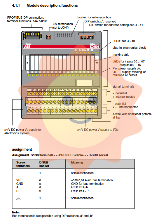 Each DP slave address is set through a 7-bit DIP switch (SW1-SW7) on the bus module, with a range of 1-125. The address is only read when the power is turned on, so a restart is required after modification. The system configuration is completed through the configuration software of the main station (such as ABB's 907 AC1131), and the correct GSD file (ABB_9521. GSD corresponds to DX 501, ABB_9520. GSD corresponds to DX 502) needs to be used. When configuring, it is necessary to follow a strict order: add the bus module first, then the expansion box (if any), and finally add the expansion modules in physical order.