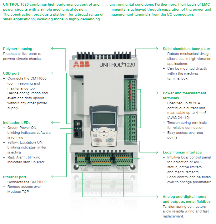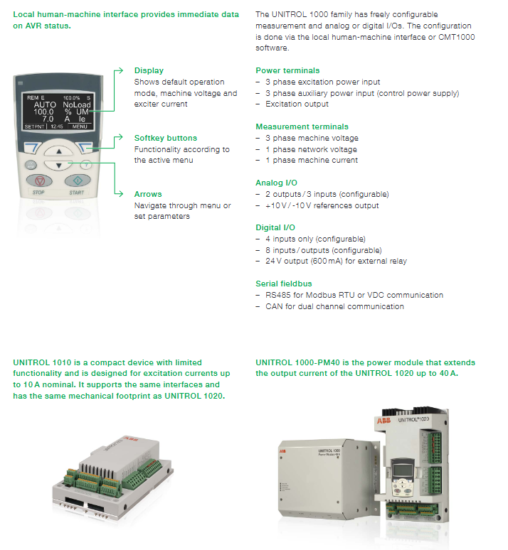In many fields such as distributed generation, ship electric propulsion, diesel locomotives, and wind power, the voltage stability of synchronous generator sets and electric motors directly determines the power supply quality and equipment safety of the power system. As the core of the excitation system, the performance of the automatic voltage regulator (AVR) not only affects the regulation accuracy of the terminal voltage, but also relates to the dynamic response and fault ride through capability of the unit's grid connected operation. ABB UNITROL ® The UNITROL 1010 and 1020 in the 1000 series are highly integrated and reliable AVR solutions tailored for small and medium power applications.