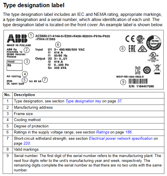 The manual specifies the series of general electrical parameters, and the differences between different models are distinguished by the "model suffix" (such as voltage level, power code):