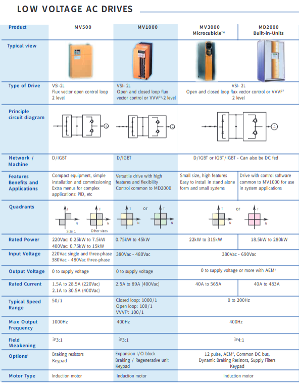 Low voltage AC drive (induction motor): 0.25kVA to 5MVA, suitable for common low voltage power grids such as 400V/690V. Typical applications include fans, pumps, compressors, extruders, and mixers.