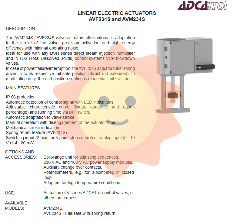 AVM234S and AVF234S are electric actuators designed specifically for valve linear drive, particularly suitable for TDS (Total Dissolved Solids) control systems consisting of DSH series direct steam injection humidifiers and VCP drain valves. The main difference between the two is that the AVF234S has a spring reset function, which drives the actuator to the preset fail safe position (push rod extension) in the event of power failure or interruption, while the AVM234S does not have a spring reset function.