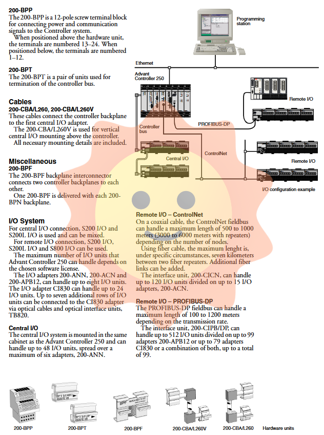 Central I/O: Installed in the same cabinet as the controller, connected through a serial I/O bus. Supports up to 48 S200/S200L I/O units, distributed across up to 6 200-ANN adapters.