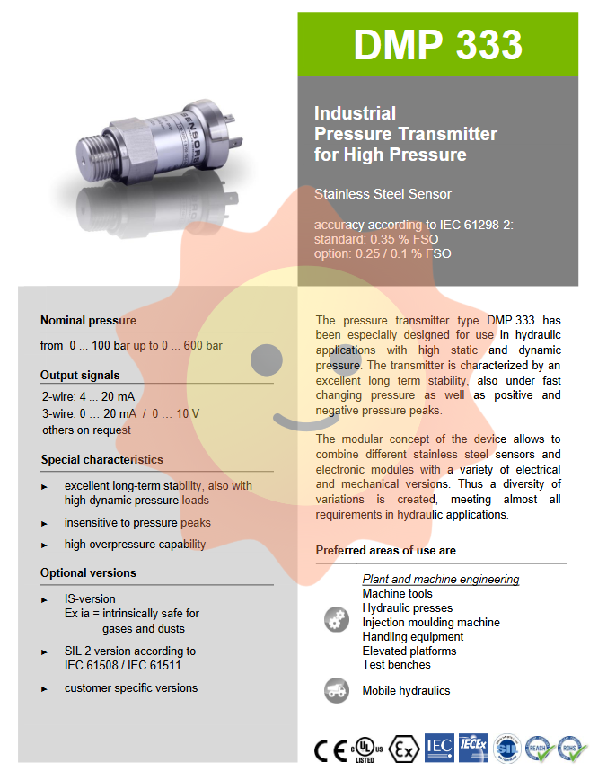 DMP 333 is an industrial pressure transmitter specifically designed for high-pressure conditions, with a focus on responding to common rapid pressure changes, positive and negative pressure peaks, and long-term continuous loads in hydraulic systems. The transmitter adopts a modular concept, allowing the combination of different stainless steel sensors and electronic modules, and is equipped with multiple electrical and mechanical interface versions, forming a rich product line that almost meets the requirements of all hydraulic applications.