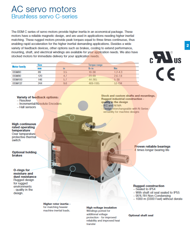 Compact Design: C Series motors are approximately 2 inches (50 mm) smaller than older models while providing the same or even higher torque density, saving valuable mechanical installation space.