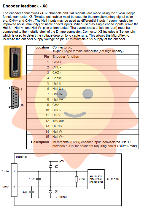 Feedback is connected through connector X8 (15 pin D-type female plug), supporting incremental encoders or SSI encoders.