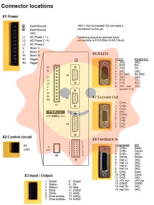 AC input power supply: Input through connector X1. The input voltage range is 105-250VAC (1 Φ or 3 Φ). Suitable circuit breakers or fuses must be installed, as well as EMC filters that comply with the CE directive.