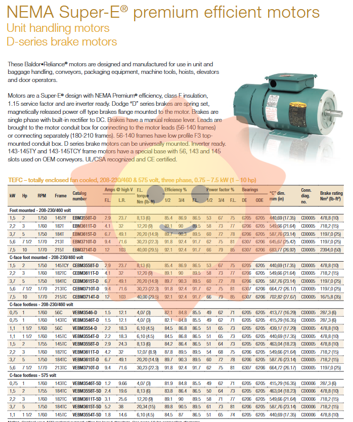 Specifications: Available in TEFC and ODP versions ranging from 3 to 20 horsepower (2.2-15 kW).