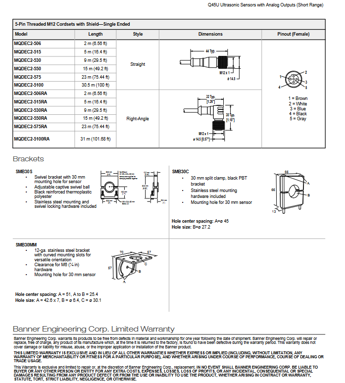 The Q45U shell is made of molded PBT polyester, with a transparent top cover made of acrylic material and sealed with an O-ring. The sensor body is cylindrical with a diameter of 30mm and can be installed through various brackets:
