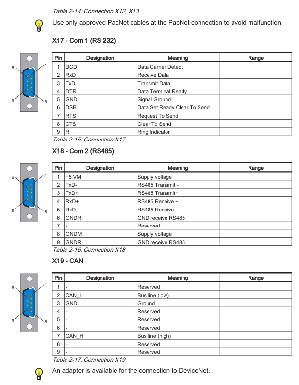 X20 PROFIBUS DP 9-pin D-type interface, master/slave mode, maximum 12MBaud rate requires the use of PROFIBUS dedicated connectors (with terminal resistors)