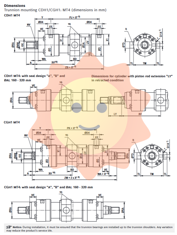 The three sub series CDH1, CGH1, and CSH1 maintain consistency in their basic structure and adopt differential cylinder design. The piston diameter range covers 40 mm to 320 mm, and the piston rod diameter extends from 22 mm to 220 mm, with a maximum stroke of up to 6 m. The main difference among the three is their functional configuration: CDH1 is the standard type, CGH1 focuses on high dynamic and servo applications, and CSH1 has a built-in magnetostrictive position measurement system, suitable for closed-loop control scenarios that require high-precision position feedback.