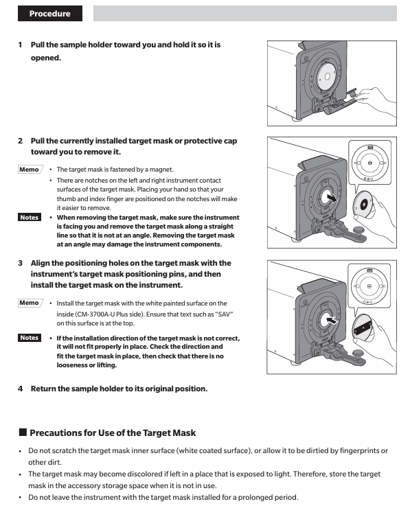 When adjusting the illumination area (sample measurement port size) of the target mask CM-A310/A314 according to the sample, CM-A310 (SAV) has a measurement area of 1 × 3mm and an illumination area of 5 × 7mm. CM-A310 (SAV) must be used for zero calibration or white calibration of CM-A314 (USAV) with a measurement area of 1 × 3mm and an illumination area of 3 × 5mm. When installing, pay attention to the direction and avoid scratching the inner white coating surface. When not in use, place it in the accessory storage space