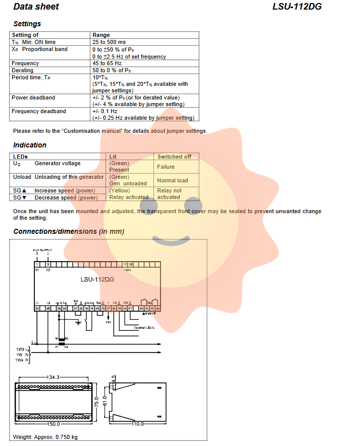 When the unit needs to be connected to the power grid, a 0.5-5V signal (from an external power controller or potentiometer) should be connected to the reference input terminal (35) to set the output power. At this time, LSU-112DG is still connected to the FS line (for frequency synchronization, but the grid frequency is fixed, so the FS line is only used for monitoring), and the PS line is used as the output to broadcast the local power (if any) to other units that may be connected in parallel. The governor will adjust the throttle to track the actual power to the set value.