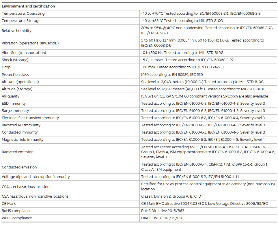 CSA certification: Ordinary area (non hazardous environment), Hazardous area (Class I Division 2, Groups A-D, non flammable)