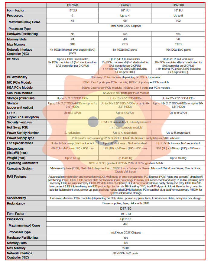 DS7080 (8U): A high-end enterprise grade server that supports 8 processors and up to 12TB of memory. Specially designed for large-scale in memory databases (such as SAP HANA), high-performance computing, and large-scale virtualization consolidation. Provides up to 28 PCIe Gen3 slots and 32 2.5-inch front facing hard drives.