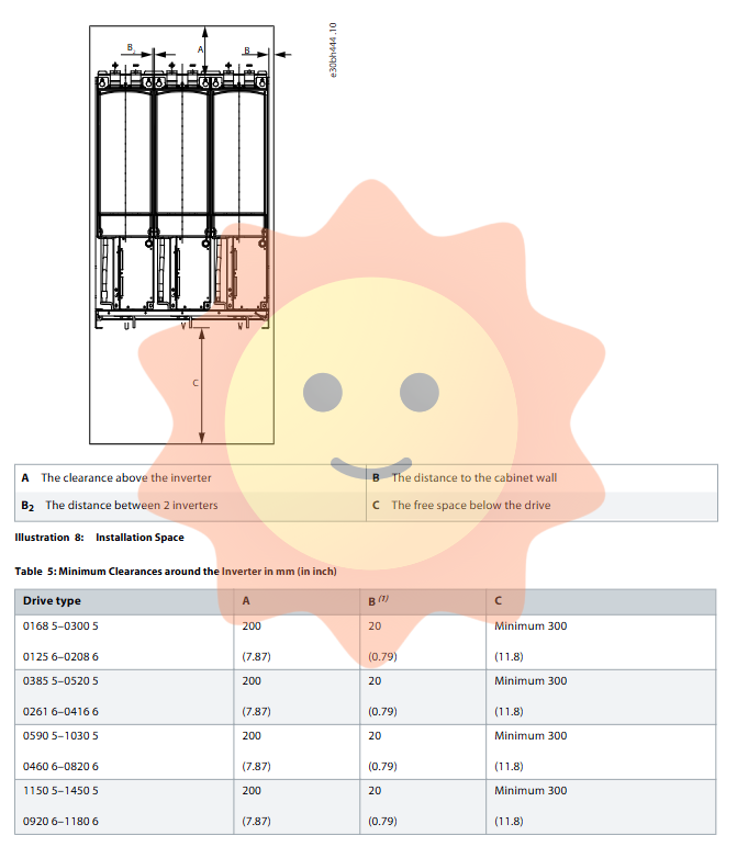 Cooling space: The manual provides detailed installation clearance requirements, including the minimum distance between the top, bottom, and sides. For FI9 to FI14, at least 200 mm of free space is required at the top and bottom. At the same time, the required cooling air volume for different models is also listed, for example, FI12 requires a cooling air volume of 2400 m ³/h to ensure effective heat dissipation.