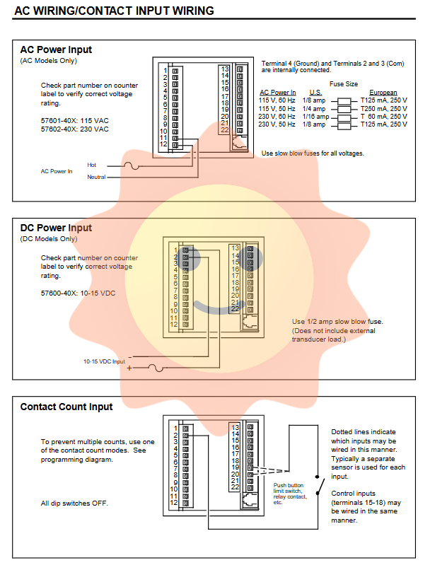 Power supply: AC 115/230 VAC ± 15%, DC 10–15 VDC