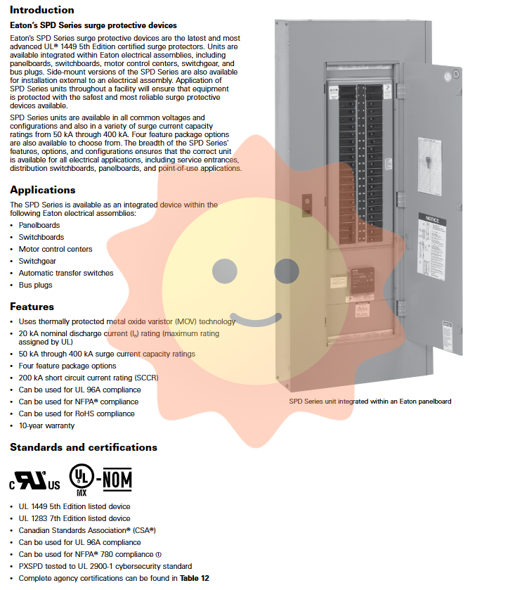 The Eaton SPD series surge protection device is the latest generation of advanced surge protection devices certified by UL 1449 5th edition. This series of products adopts thermal protection metal oxide varistor (MOV) technology and can be integrated into various types of Eaton distribution equipment, including distribution panels, switchgear, motor control centers, medium voltage switchgear, automatic transfer switches, and busbar junction boxes. In addition, the SPD series also offers a side mounted version that can be installed outside of electrical equipment.