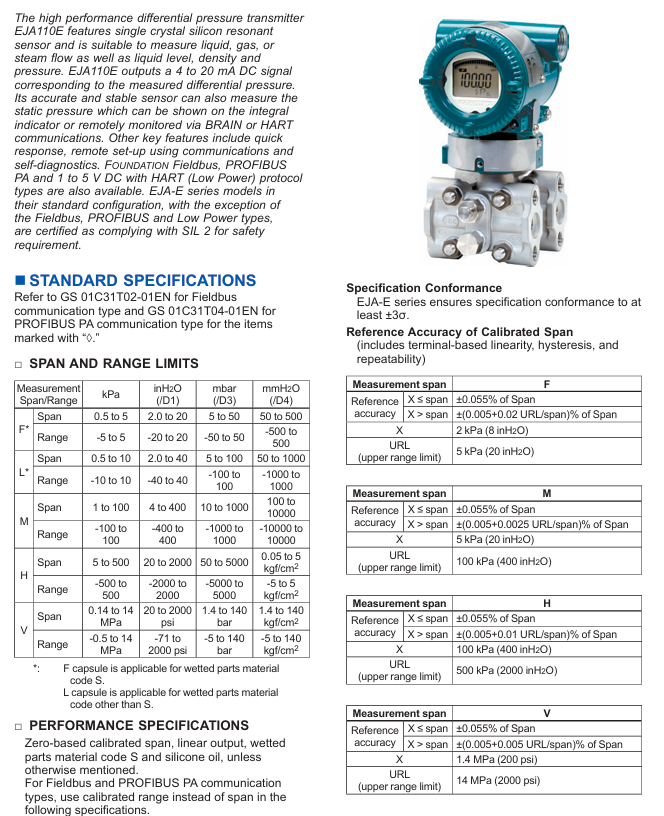 Different capsule types (F, L, M, H, V) correspond to different measurement spans and ranges, covering multiple pressure units (kPa, inH ₂ O, mbar, mmH ₂ O, kgf/cm ², MPa, psi, bar). The following are examples of key parameters: