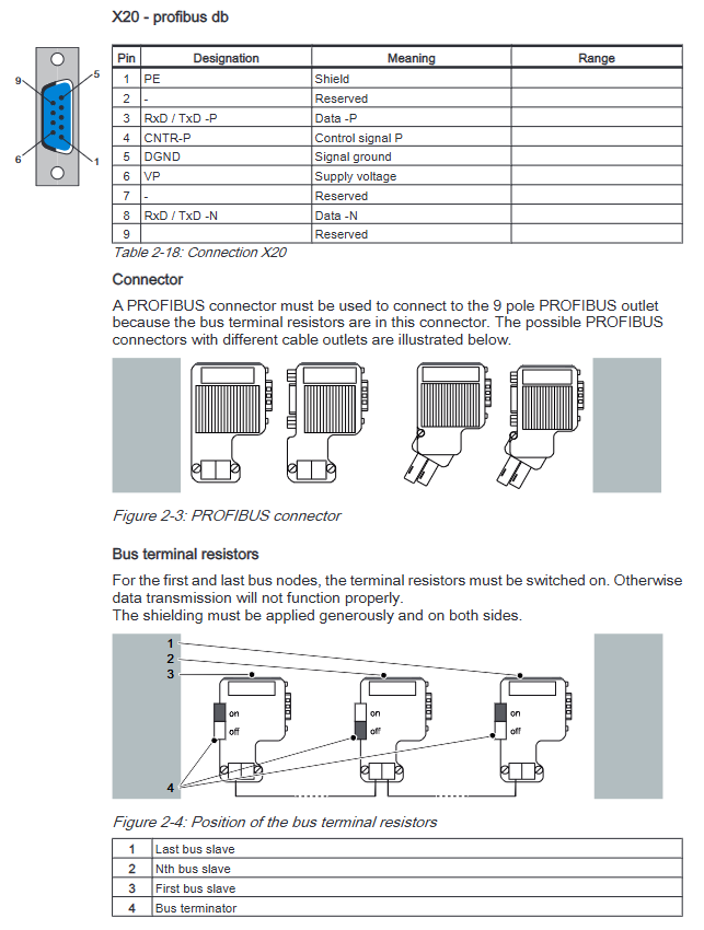 PROFIBUS specific connectors with terminal resistors must be used. The terminal resistors of the first and last nodes of the bus must be turned to the "ON" position, and the middle node must be turned to the "OFF" position.