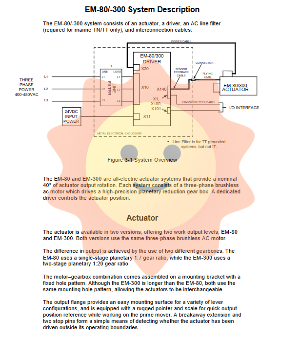 The EM-80 and EM-300 do not have internal mechanical stops. The stroke is electronically limited to 40 degrees. However, the system includes “soft stops” at 47.5 degrees. Inside this zone, the actuator can recover from a power failure and return to the correct working zone. If external forces drive the actuator beyond 47.5 degrees, the system may not be able to re-locate the proper working zone. While the actuator has a protective strip and stop pins to prevent accidental rotation, these stops cannot withstand the actuator’s peak torque.
