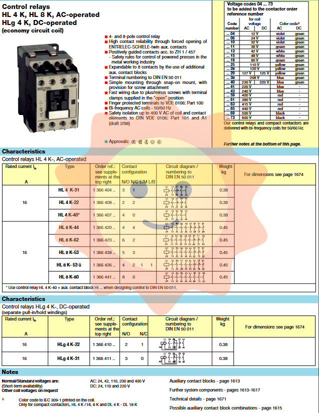 Control relays and compact contactors come standard with 50/60 Hz dual frequency coils, eliminating the need to replace coils based on power frequency, simplifying inventory and selection. The coil voltage code follows the color identification of IEC 309-1 (e.g. 24V AC is purple, 24V DC is green). For N series contactors, single frequency coils (50Hz or 60Hz) can be provided.