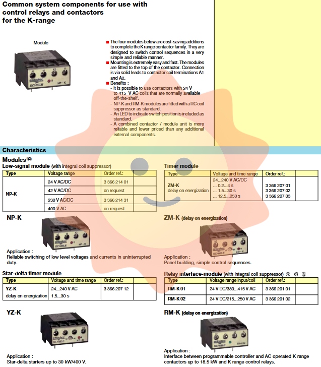 RM-K Relay Interface Module: Used as an interface between PLC and AC operated K-series contactors (up to 18.5kW), with an input of 24V DC and an output of 380-415V AC or 215-250V AC.