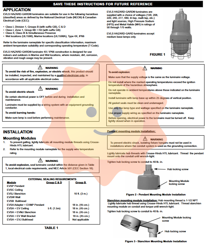 The EVLS HAZARD-GARD series explosion-proof lighting fixtures are suitable for the following hazardous areas (compliant with the National Electrical Code NEC and the Canadian Electrical Code CEC):