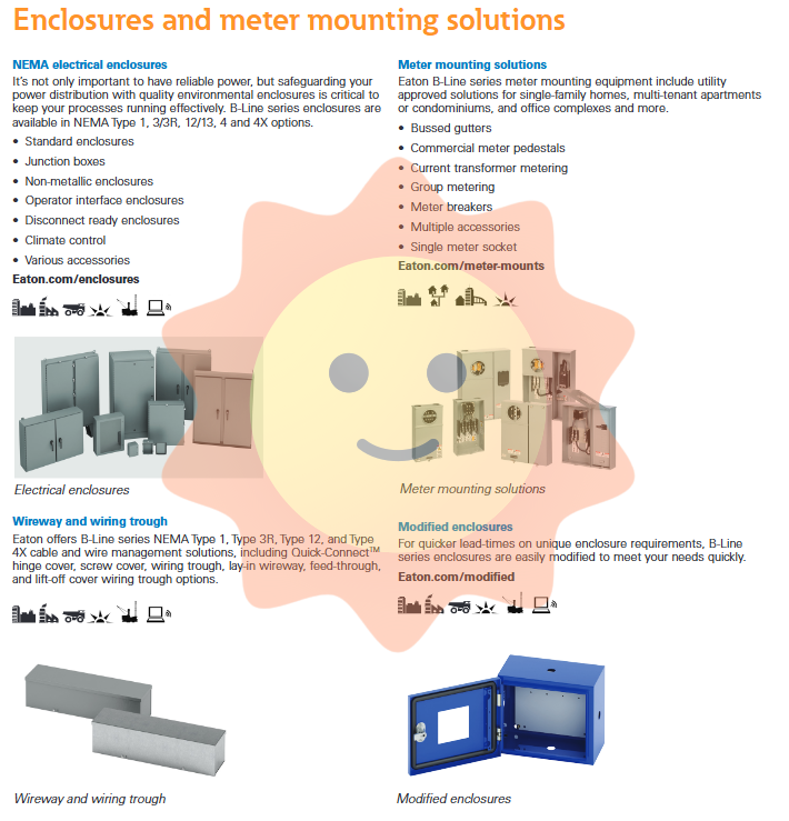 Reliable power supply relies on high-quality environmental protection. The B-Line series chassis offers multiple protection level options such as NEMA Type 1, 3/3R, 12/13, 4, and 4X. The product line includes standard chassis, junction boxes, non-metallic chassis, operator interface chassis, isolation switch chassis, climate control equipment, and various accessories.