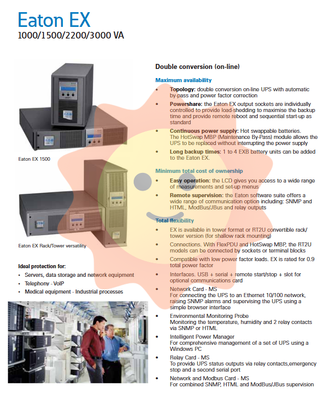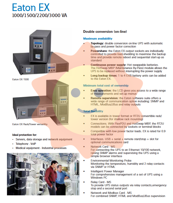 The Eaton EX series UPS covers multiple power ranges from 1000 VA to 3000 VA, offering tower and rack mounted (RT2U) installation options, suitable for diverse scenarios ranging from small and medium-sized enterprise data centers to industrial control cabinets. This series adopts a dual conversion online topology structure, equipped with automatic bypass and power factor correction functions, ensuring that the output power is always pure and stable.