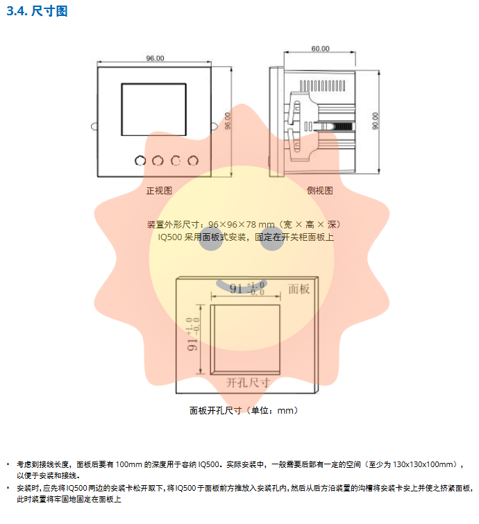 Dimensions: 96 × 96 × 78mm (width × height × depth), in compliance with DIN96 × 96 standard