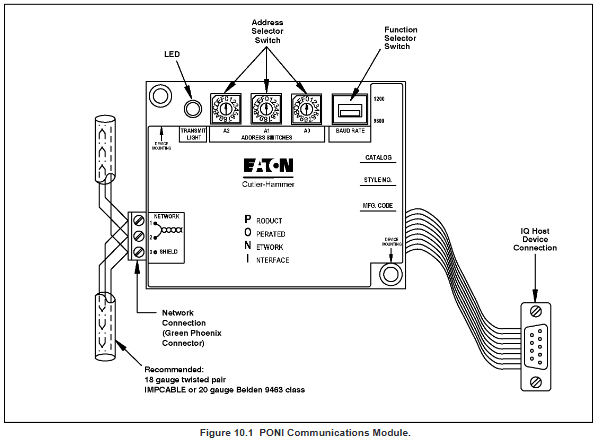 The PONI communication module is an integrated structure with an internal chassis, connected through terminals