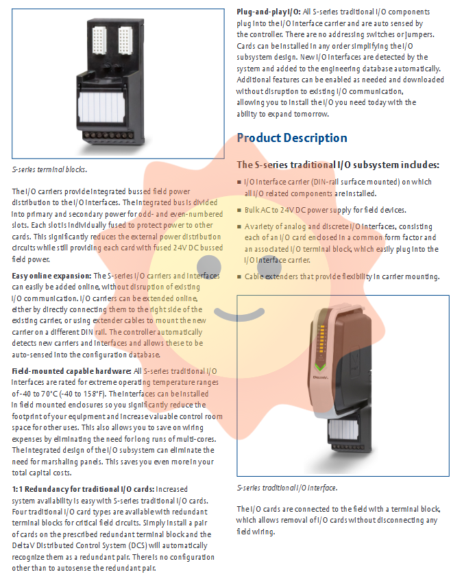 DeltaV ™ The S series provides a wide range of I/O cards, covering various signal types such as analog and discrete, to meet diverse process control requirements. All cards support wide temperature operation and have high precision and isolation characteristics.
