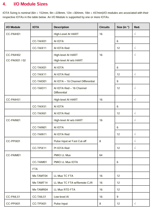 The size of IOTA varies with module type (analog/digital) and redundancy requirements. Non redundant configurations have smaller sizes, while redundant configurations require longer IOTA. The specific adaptation relationship is as follows (excerpt from core combinations):