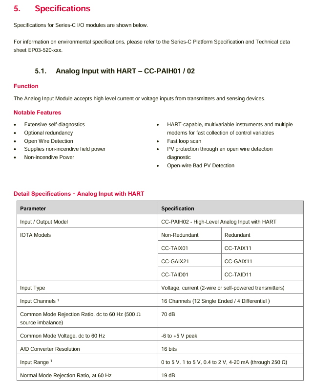 CC-PAIH01/02 with HART protocol 16 current (4-20mA), voltage (0-5V/1-5V/0.4-2V) 12 single ended+4 differential channels, supports open circuit detection, Class 1 Div 2 non flammable power supply