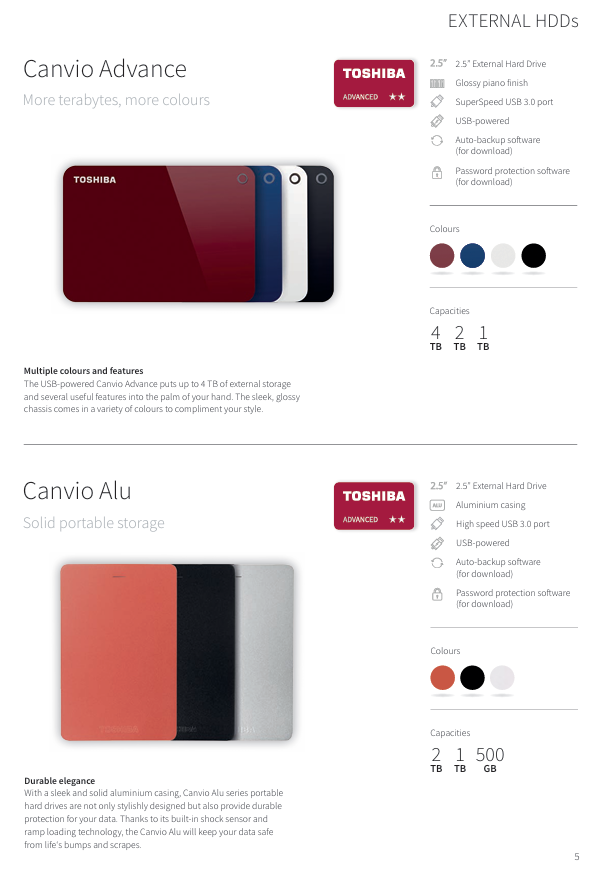 Canvio Premium 2.5-inch aluminum casing with diamond cut edge automatic backup software (downloadable), password protection software (downloadable), Type-C adapter (A to C), soft bag 1TB/2TB/4TB for 3 years
