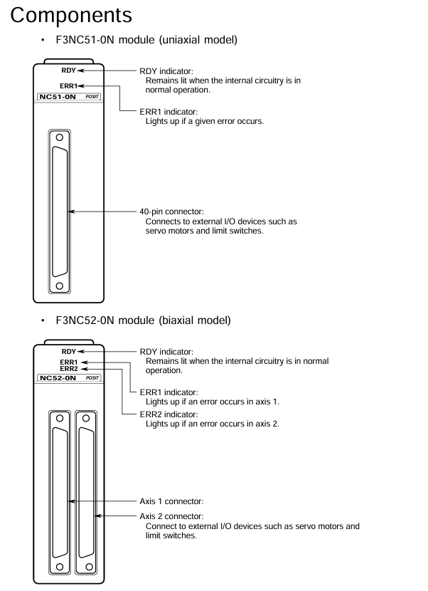 F3NC51-0N (single axis): RDY indicator light (always on when the internal circuit is normal), ERR1 indicator light (lit when an error occurs), 40 pin connector (connected to external I/O devices such as servo motors and limit switches).