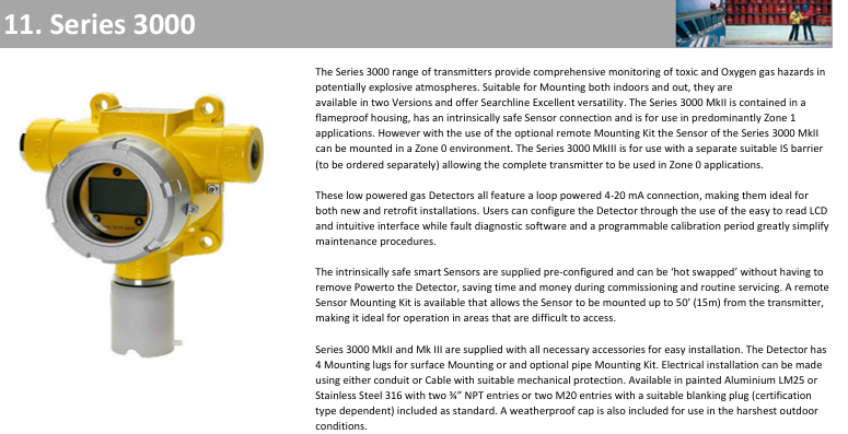 Series 3000 MkII/MkIII: For toxic gas and oxygen monitoring, MkII is equipped with a flameproof shell and MkIII needs to be used with a safety barrier for Zone 0 area. It supports remote sensor installation (up to 15 meters away) and has a low-power design suitable for new installation and renovation projects.